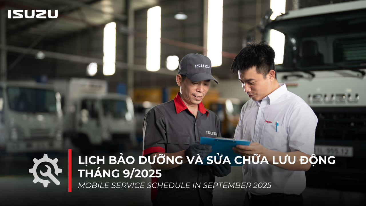 Nhằm tri ân khách hàng đã tin dùng sản phẩm cùng với mong muốn được đồng hành và chăm sóc cho xe được vận hành trong điều kiện hoàn hảo nhất, ISUZU Việt Nam xin gửi đến Quý Khách hàng lịch trình tổ chức chương trình “Bảo dưỡng & Sửa chữa lưu động” trong tháng 9 năm 2025.